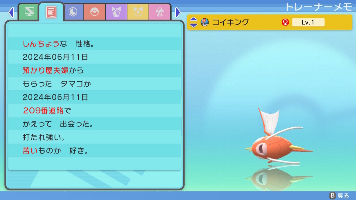 まずは6/9です。この日から6/13まで孵化歩数を計測していきます。ポケッチに万歩計アプリがあるのでそれを確認しながらしていきます。また、間違いがないようにカウント0にして話しかけてタマゴをもらうという形式で検証していきます。